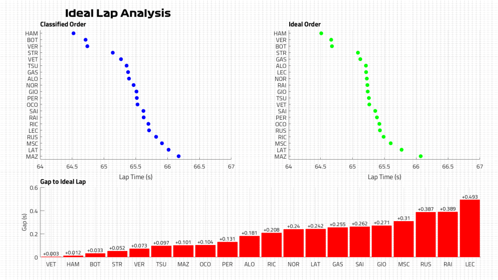 Verstappen ended up third overall, but would have been second – according to our ideal lap data (in the chart below) – if he had put all his best mini sectors together. He left 0.073s on the table, which would have reduced his deficit to Hamilton to just over a tenth of a second.