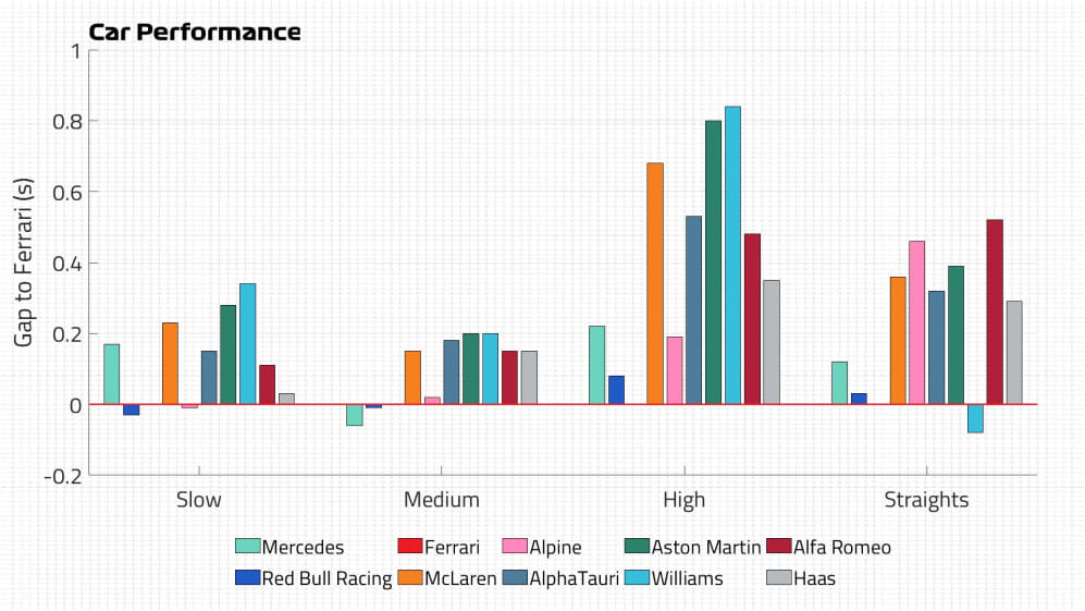 When breaking down how Red Bull and Ferrari compare, our data shows that Red Bull have a slender advantage in the slow-speed corners, with Ferrari having an even smaller edge in the medium turns.