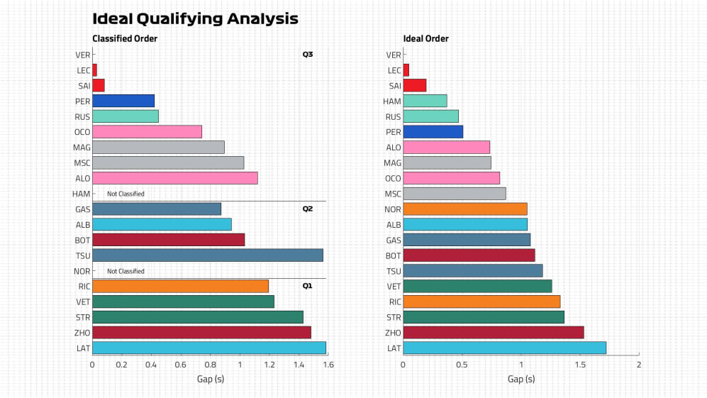 But our data shows that based on the running we saw, even if Hamilton and Russell had got their best laps in the bag, they would have been fourth and fifth respectively.