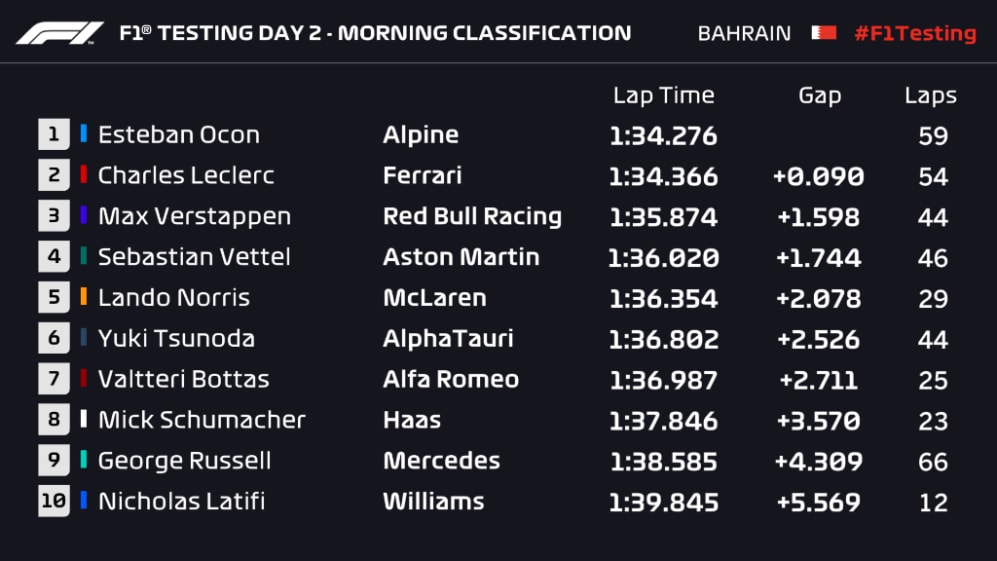 Esteban Ocon topped the timesheets on the second morning of 2022 pre-season testing in Bahrain – before Nicholas Latifi, Sebastian Vettel and Valtteri Bottas all stopped in separate incidents.