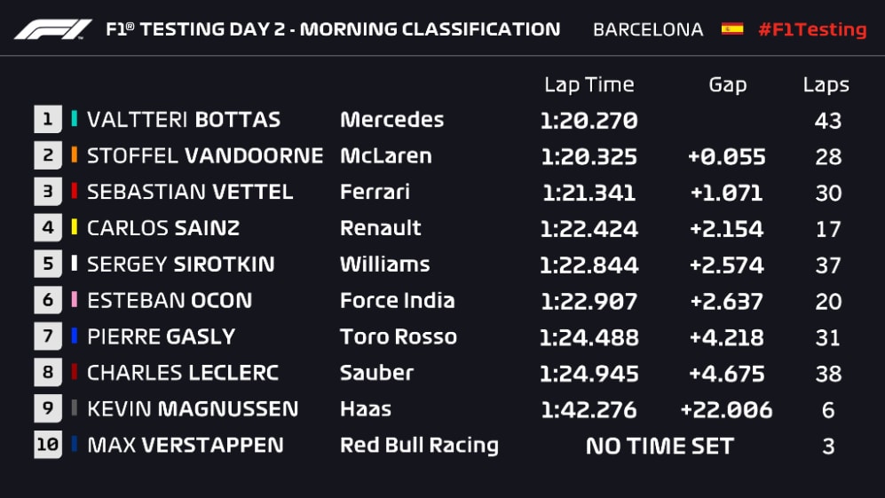 F1 newcomers Sergey Sirotkin and Charles Leclerc both managed more than 35 laps for Williams and Sauber respectively, while at the other end of the scale Haas’s Kevin Magnussen and Red Bull’s Max Verstappen spent the majority of the morning in the garage, the latter failing to log a lap time after a spin and what the team described as 'a minor fuel leak'.