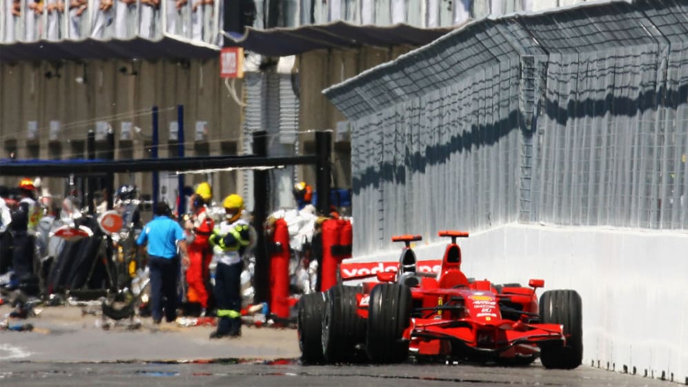 He desperately steered hard left, trying for the gap between Raikkonen and the wall, but it was too late and in trying for the gap he missed Kubica but hit Raikkonen’s Ferrari hard.