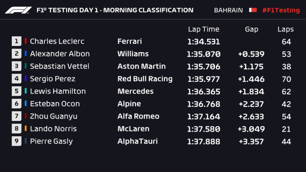 Ferrari's Charles Leclerc set the fastest time on the morning of Day 1, as the Official Pre-Season Test got underway in Bahrain.
