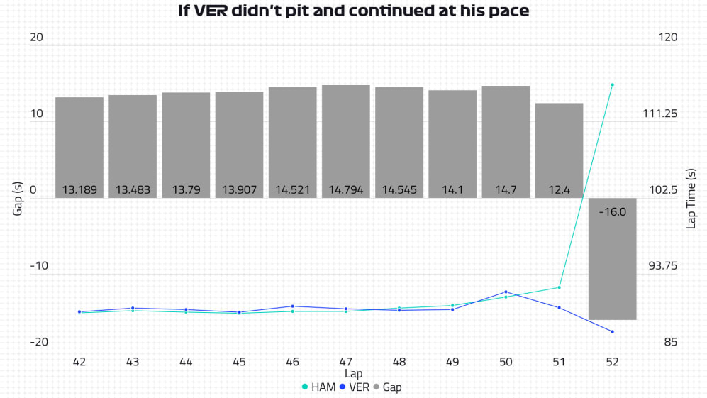 If Verstappen had stayed out and kept the same pace, our data – shown in the graph below – shows he would have won by over 16s, if other events played out in the way they did.