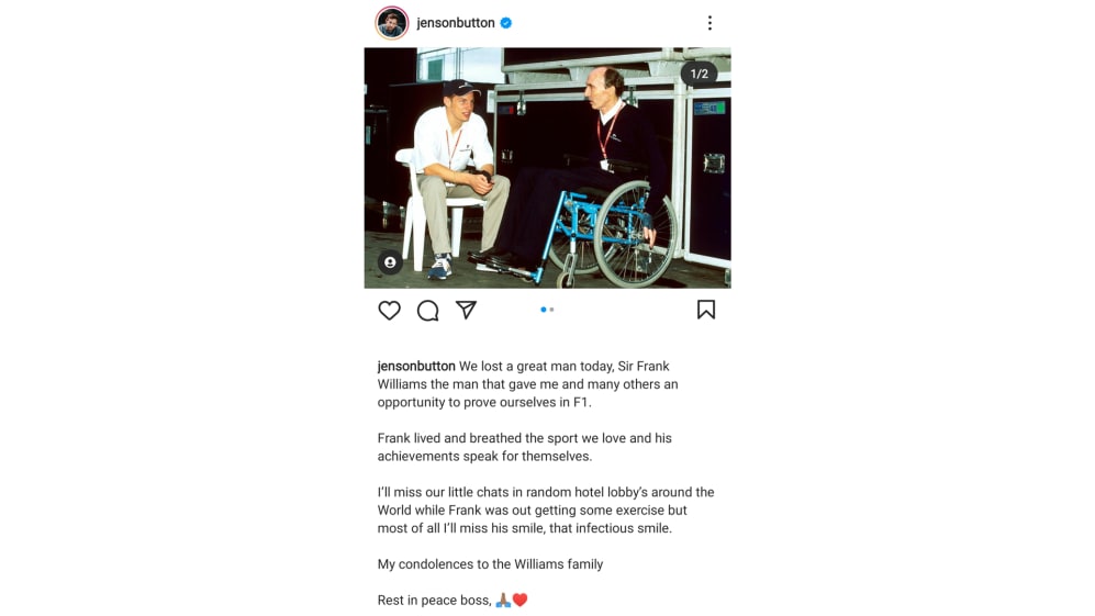 Scroll down to see how current and former Williams drivers, F1 champions, fellow team bosses and F1 teams gave their respects to Sir Frank Williams – and watch the video above as more figures from the world of F1 remember the former Williams chief.