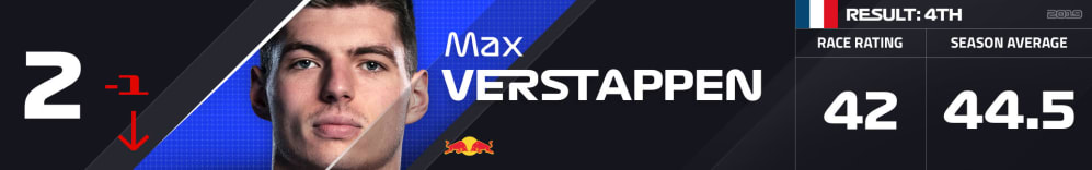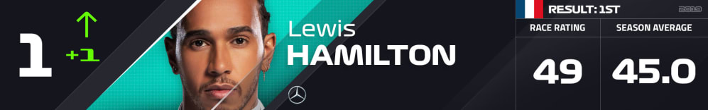 He’s only gone and done it. Having not been top of the Power Rankings at any point this year, a crushingly dominant Q3 and race performance in France sees Hamilton unseat Max Verstappen from his six-race reign at the toppermost of the top 10. Hamilton’s score of 49 matches his tally from his win in Monaco a month ago, although his second consecutive FP2 mistake – albeit that this one was nowhere near as costly as his Canadian Grand Prix one – probably just stopped Hamilton becoming the third driver this year to take a perfect 50 (after Valtteri Bottas in Australia and Charles Leclerc in Bahrain).