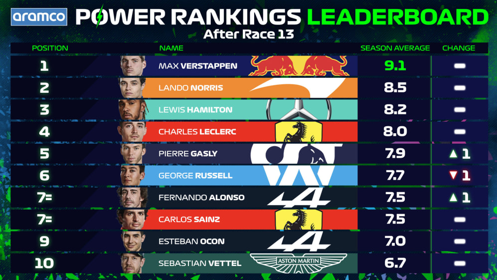 Max Verstappen’s lead grows at the top of the standings, while Pierre Gasly nips into P5, demoting new Mercedes signing George Russell to sixth. Eagle-eyed fans will notice that Robert Kubica hasn’t made the cut despite now technically having a season-average of 7.3 – with our judges ruling that it went against the spirit of the Power Rankings to include the Pole.