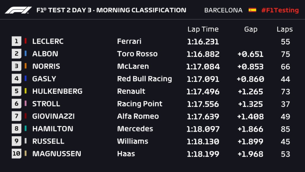 Charles Leclerc put Ferrari top of the timesheets at the Thursday lunchbreak of Test 2 of 2019 pre-season testing, with by some way the fastest lap seen so far in Barcelona this year, a 1m 16.231s set on the softest C5 rubber.