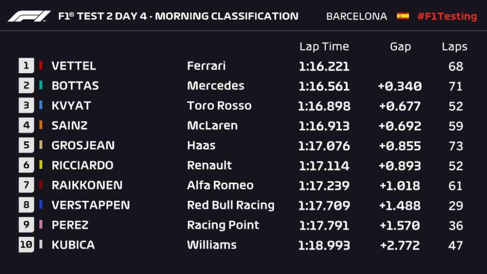 Sebastian Vettel kept Ferrari on top at the lunch break of the final day of 2019 pre-season testing, and with a new testing lap record to boot. But Mercedes finally posted what looks to be a more representative time, Valtteri Bottas setting a 1m 16.561s to trail Ferrari by around three-tenths of a second.