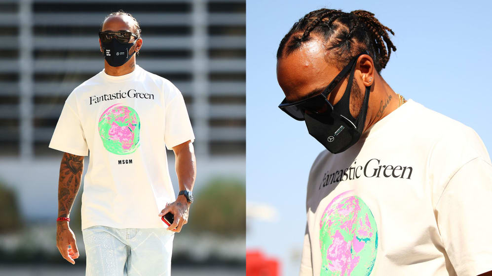 Bahrain might not be famous for its greenery, but that didn’t stop Hamilton heading out into the paddock at Sakhir sporting this ‘Fantastic Green’ T-shirt from Italian brand MSGM.