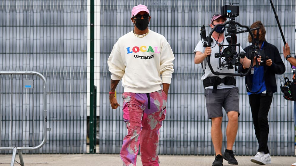 Optimism was a much needed commodity in 2020, and Hamilton attempted to inject some into the paddock at Silverstone with this ‘Local Optimist’ sweatshirt from brand Madhappy, completed by a pair of trippy trousers from The North Face x Supreme collaboration.