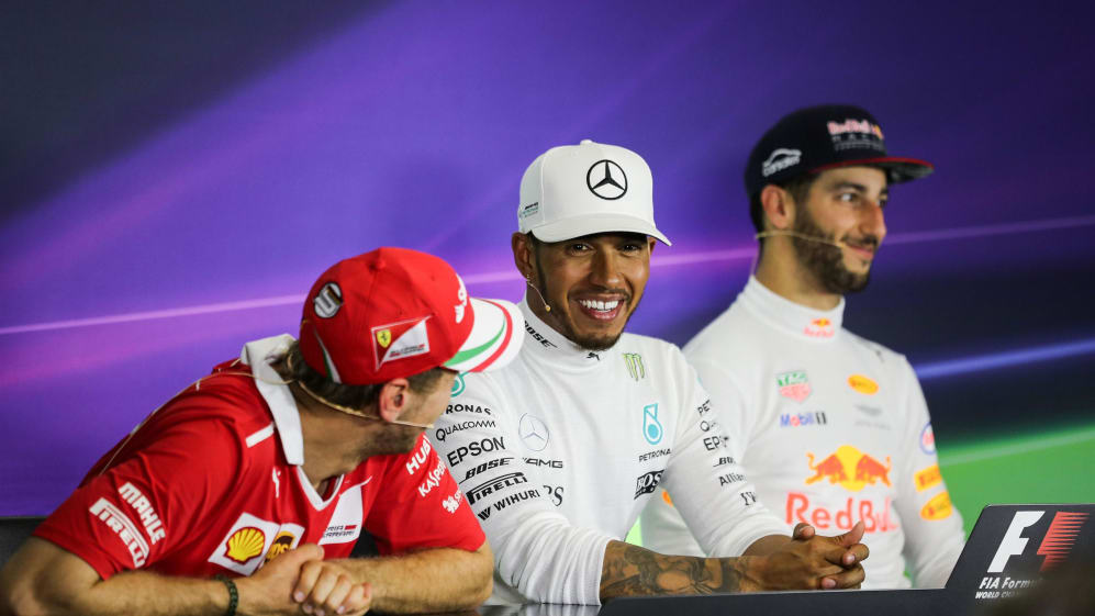 Drivers: 1 - Lewis Hamilton (Mercedes), 2 - Sebastian Vettel (Ferrari), 3 - Daniel Ricciardo (Red Bull).