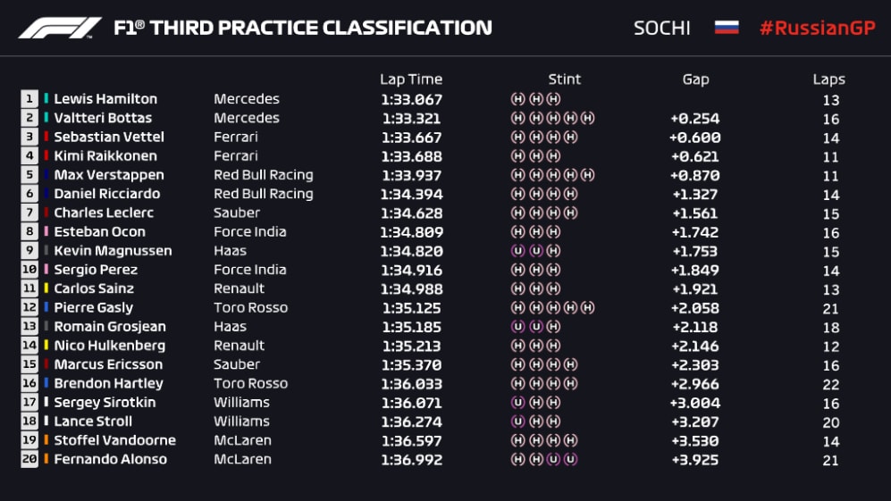 After Verstappen, no one else could get within a second of Hamilton’s 1m 33.067s marker – a new outright track record for the Sochi Autodrom. Ricciardo aside, Charles Leclerc came closest, with an encouraging P7 for Sauber after his struggles with set-up on Friday.