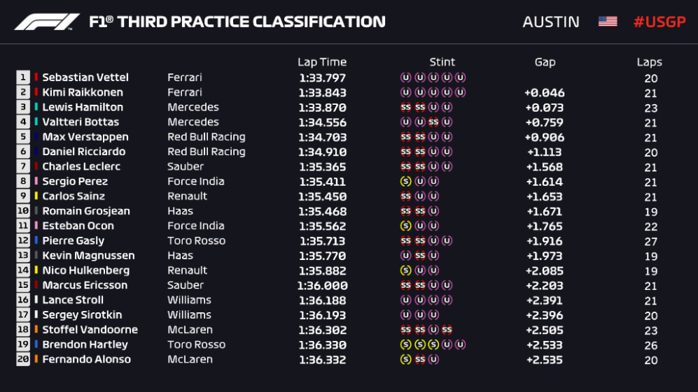 Bottas then all but matched them on the supersofts midway through the hour, before the scarlet cars pulled clear once more on the quicker, purple-marked rubber – the only compound the Scuderia ran. Late, ultrasoft runs from all then saw the times close right up at the top.