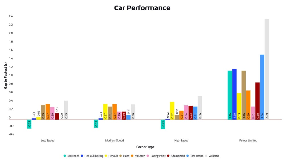 Alfa Romeo, McLaren and Toro Rosso were reasonably well-matched when it comes to long run pace, with Williams taking up a familiar position at the back of the grid. We don’t have any long-run data for Haas, as neither Romain Grosjean or Kevin Magnussen did enough long stints for our data team to analyse.