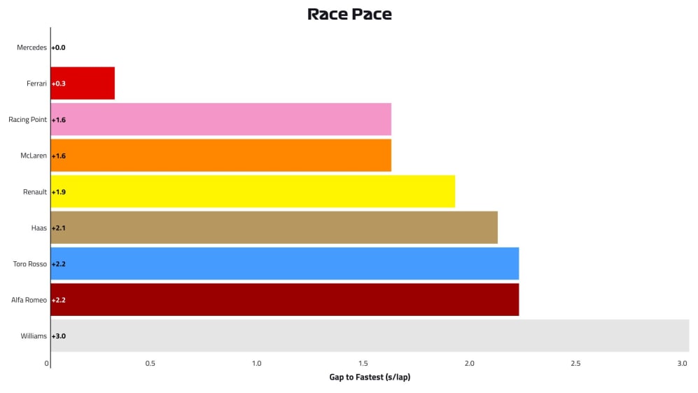Racing Point and McLaren were best of the rest, the latter not having the best of days as Lando Norris and Carlos Sainz spoke of a lack of overall grip and therefore confidence in the car. But their race pace was at least encouraging, particularly in relation to Renault, who were 0.3s/lap slower.
