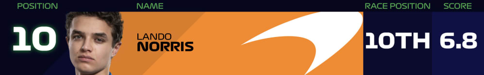 Meanwhile Sainz jumps two places to fourth as Leclerc goes the other way, while Perez’s score of 9.6 sees him demote Bottas to 10th – the Finn in danger of falling out of the top 10 by season-end if he doesn’t perform at Yas Marina.