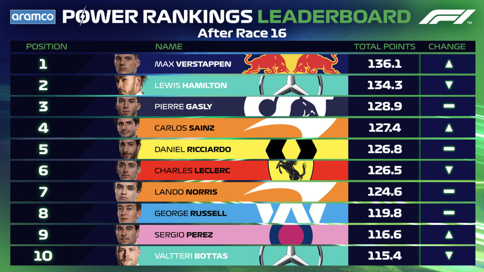 Hamilton’s non-score for the Sakhir Grand Prix means that, despite Max Verstappen not finishing the race, he moves to the head of the standings – and will likely be crowned the Power Rankings king if Hamilton is unable to make it back in time for Abu Dhabi.