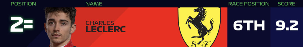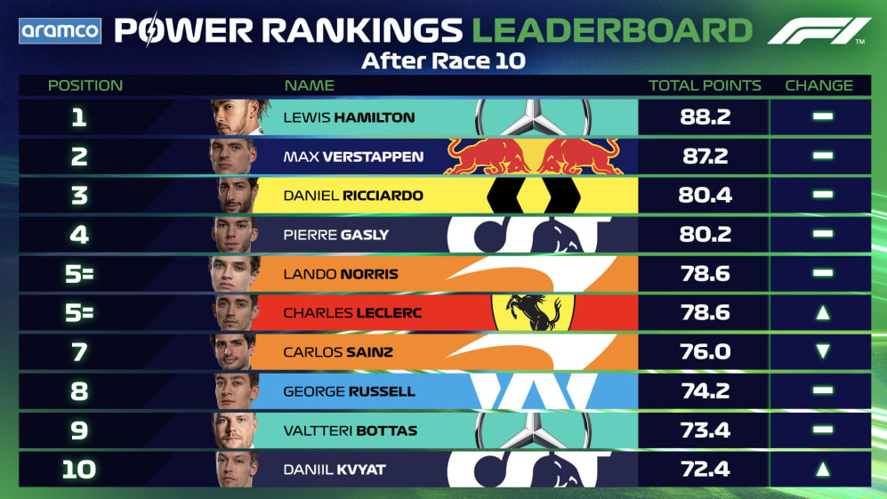 Hamilton holds onto the top slot in the overall standings, but his lead has shrunk to a solitary point over Verstappen. Daniil Kvyat replaces Alex Albon in the top 10 (Albon having earned just a 5.2 for his 10th-placed Russian performance), while Kvyat and Charles Leclerc are the biggest climbers post-Sochi, both moving up two spots.