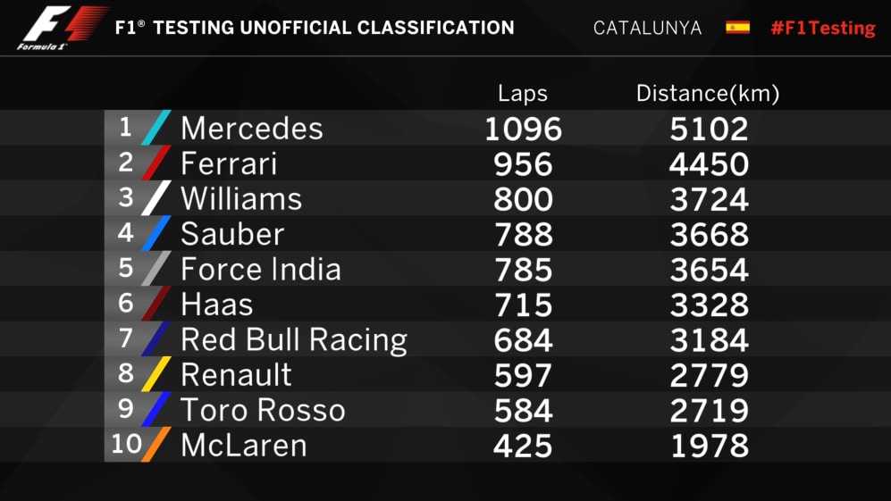 With the allowed eight days of pre-season running over, teams now head back to their bases to digest their data and prepare their cars for the year's first race in Australia on March 26. Until then, the numbers below are the closest we'll get to a 'formbook'...