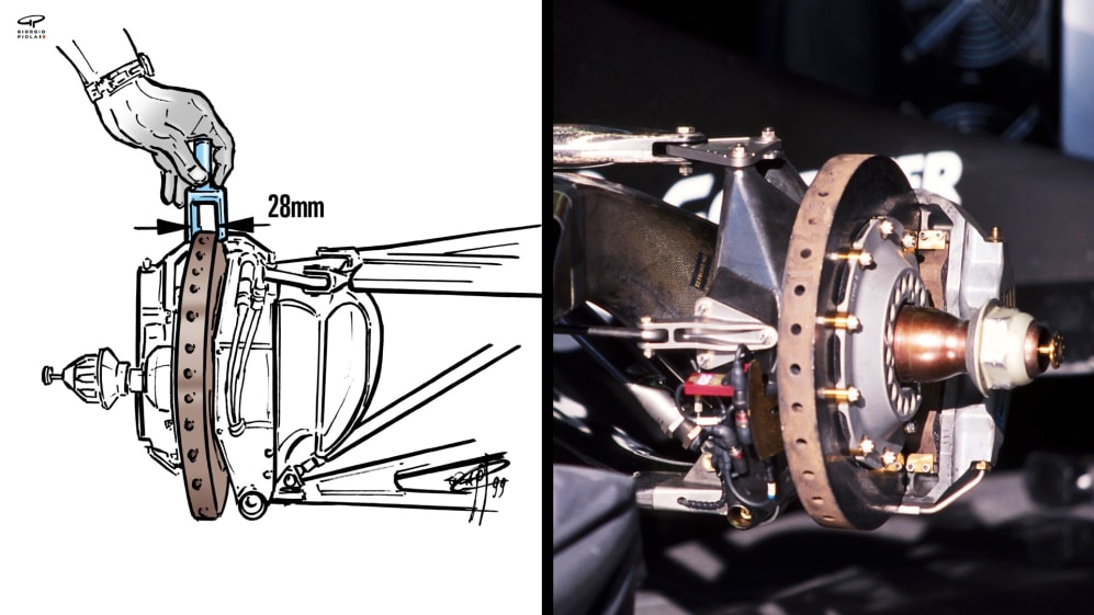 The third major rule change was to brakes (pictured below), with the FIA making several moves aimed at limiting braking performance, improving the possibility of overtaking and reducing costs. The first decision was to ban teams from using exotic materials (like Beryllium, a material available to some but not all) and return to plain aluminium calipers with a designated maximum stiffness. The teams would also be limited on each wheel to no more than one caliper (with a maximum six pistons), no more than one brake disc and no more than two brake pads. Disc thickness was also cut from 34mm to 28mm - a size that is only being changed this season, when it goes back up to 32mm.
