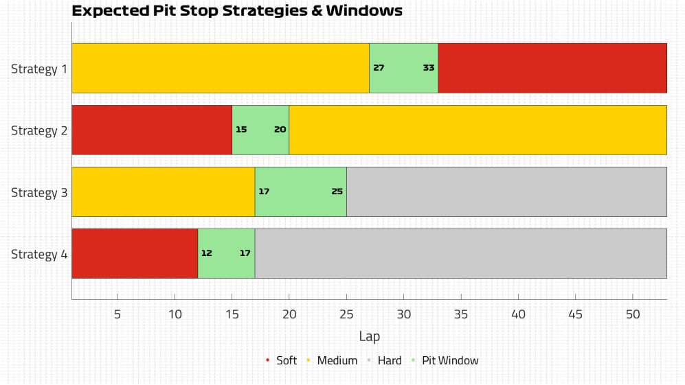 The key to this will be the first stint, with the mediums needing to reach at least lap 30. If that is achieved, then a switch to the softs is likely to be picked. If the first stop is needed before lap 30, then the hards can be fitted.