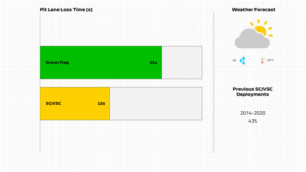 It’s looking extremely unlikely, but Safety Car interruptions could open up that possibility. As mentioned earlier, the pit lane loss is big in green flag conditions but greatly reduced under either the Safety Car or Virtual Safety Car, dropping to around 12 seconds.