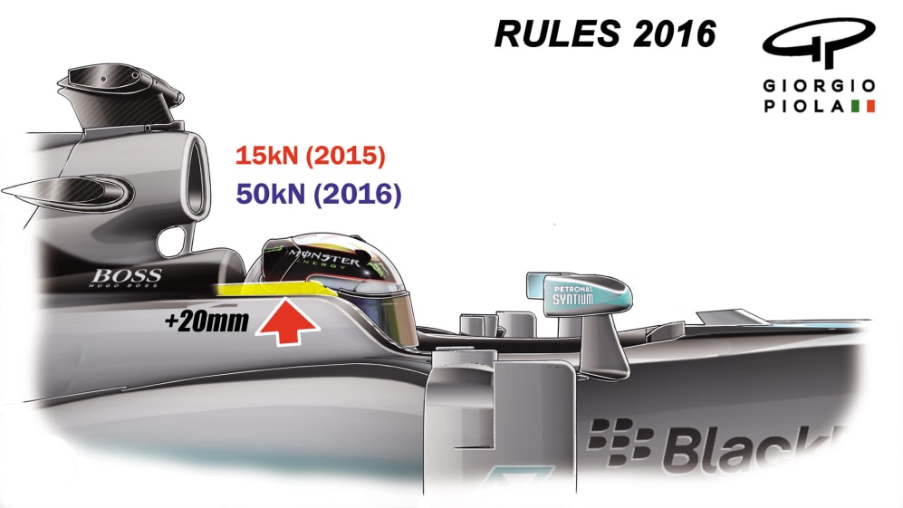 As a result of these tests the Mercedes design was chosen for implementation in 2018. In the meantime, for 2016 the cockpit rim test was increased in severity from 15kN to 50kN and the height of the side protection was increased by 20mm (below). A kilonewton (kN) is a measure of force, 1 kN being the amount of force required to move 1kg at a speed of one metre-per-second, for 1s of time.