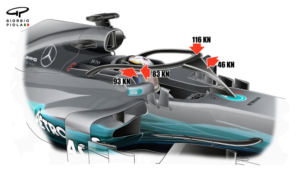 As Mercedes' James Allison summarised at the halo’s introduction: “We had to strengthen the design of the chassis so it would be able to take roughly the weight of a London double decker bus sitting on top of the halo.”