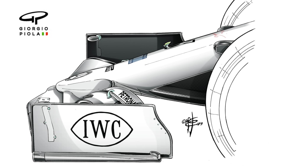 This creation of space between the rearmost element and the front wheel will have the effect of enhancing the outwash of airflow around the wheel, moving away slightly from the extreme that Merc’s original full-depth wing represented. A small detail change can be seen in a new cut-out slot at the back of the endplate’s foot section and this is likely creating a small vortex that enhances the outwash effect of the new element arrangement.