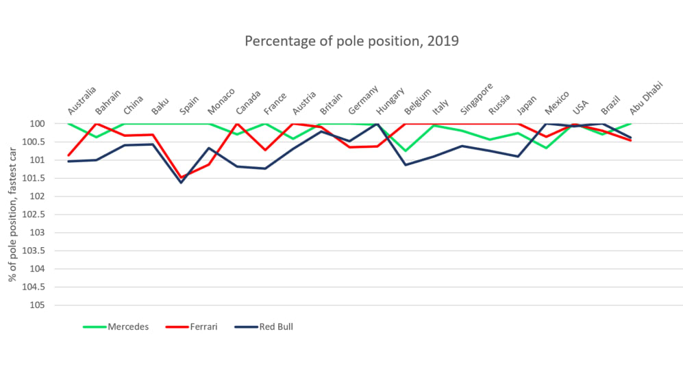 If we look at the accompanying chart of qualifying performance, below, showing the relative competitiveness of each of the top three cars at every venue last season, we can see that the least competitive Mercedes showings tally strikingly well with the most rear-limited circuits.