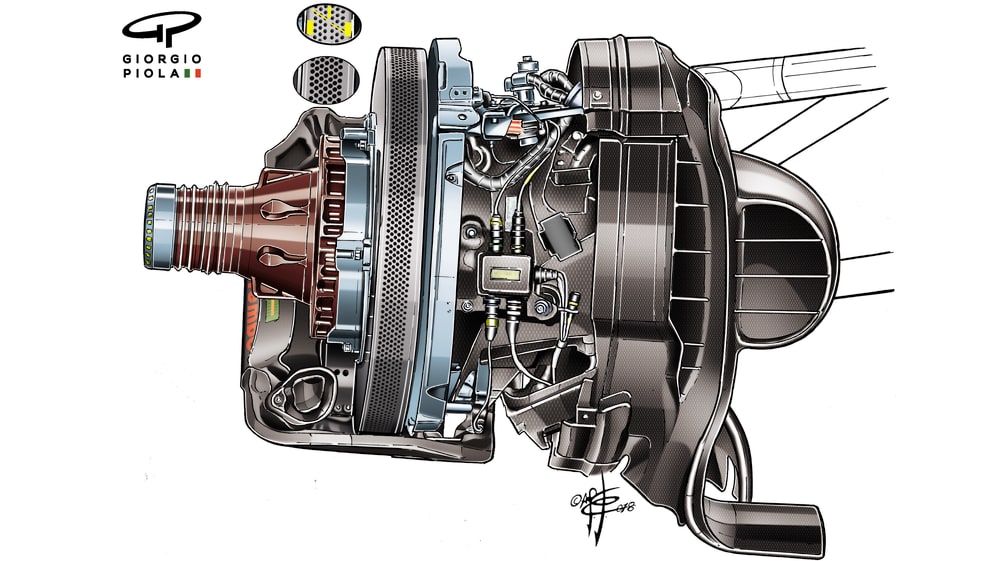 Ferrari, meanwhile, introduced a new Brembo brake disc with 1,400 diagonally-arranged cooling holes across its width rather than the usual 1,200. Without this, they would have been forced to run even bigger brake ducts, which cost aerodynamic performance.