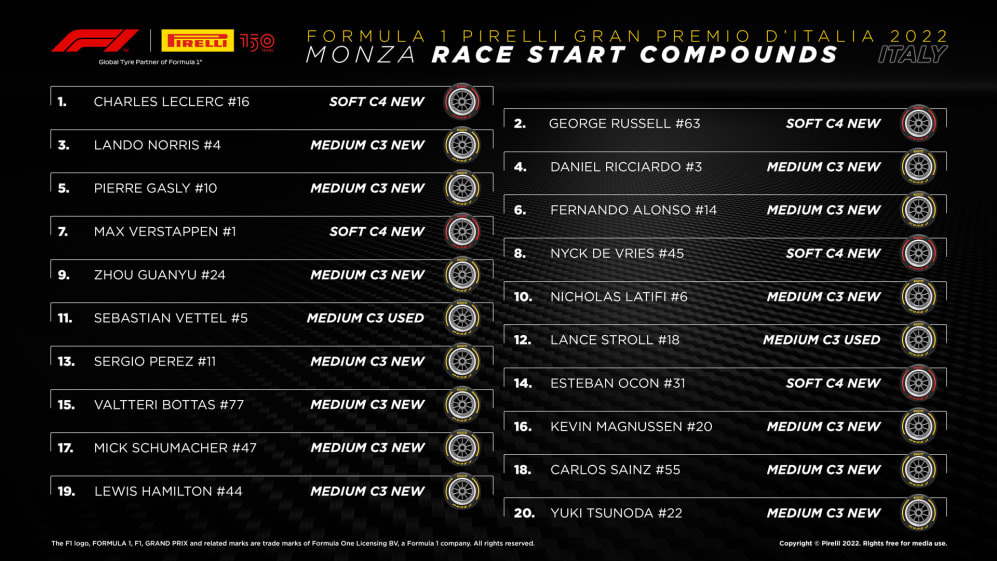 Sun beaming down on the Temple of Speed, it was time for the 2022 Italian Grand Prix – 100 years after Monza was constructed. Five drivers – Leclerc, Russell, Verstappen, de Vries, and Ocon – would begin on brand-new soft tyres with the rest on mediums.