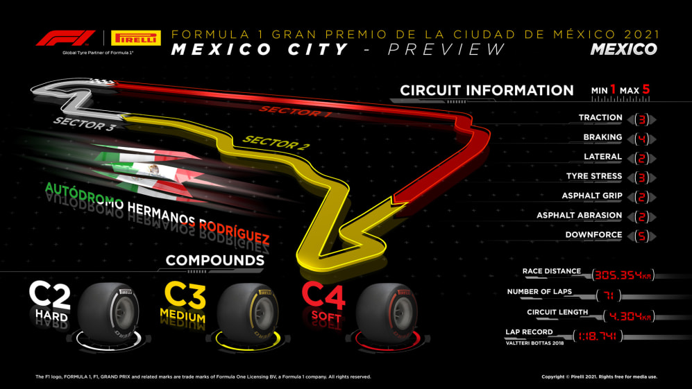 “The high altitude in particular, as well as the circuit layout itself, always throws up a number of interesting challenges and surprises in Mexico, so it’s often an unpredictable race with a wide variety of strategic options," said Pirelli Head of F1 and Car Racing Mario Isola.