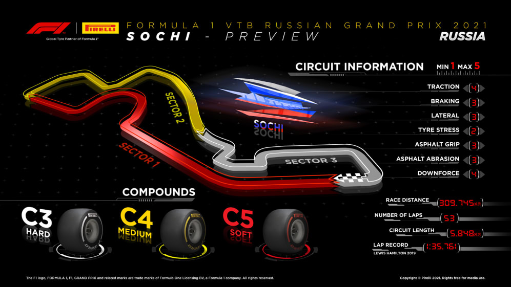 Pirelli have nominated C3 (hard), C4 (medium) and C5 (soft) tyres for this event – the same allocation as in the 2020 Russian GP that was won by Valtteri Bottas. Each driver will receive two hards, three mediums and eight softs this weekend.