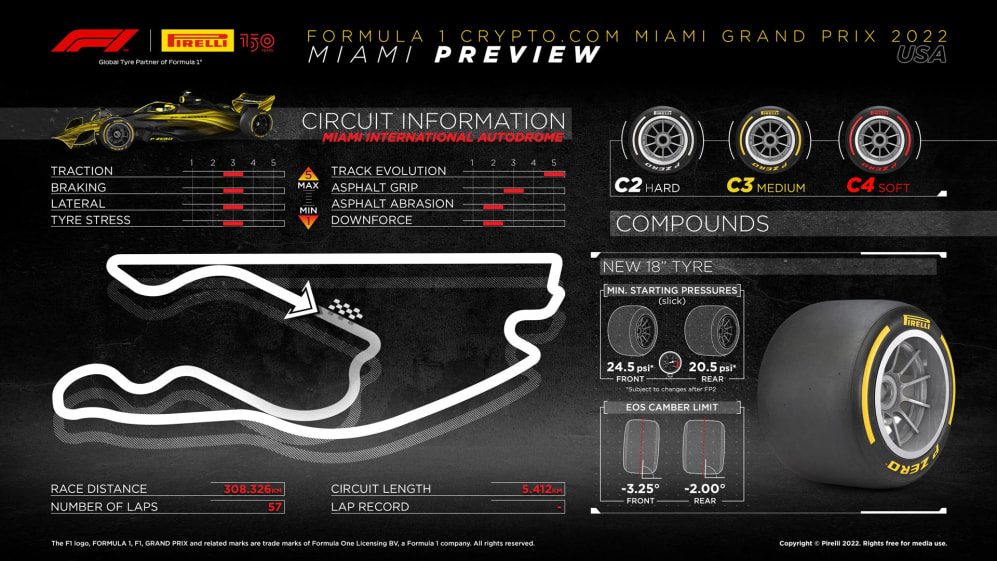 With expected top speeds in the region of 320km/h, 19 corners, three straights and three DRS zones, Pirelli have opted to bring the most commonly-used combination of compounds to the brand-new Miami International Autodrome.