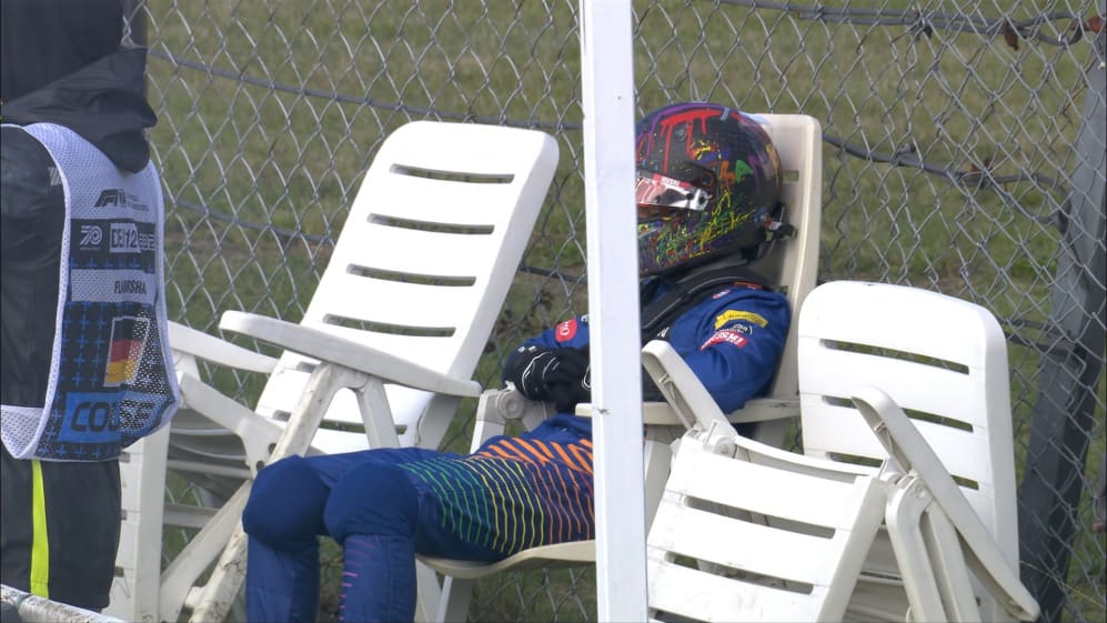 Lando Norris took inspiration from Fernando Alonso in the 2015 Brazilian Grand Prix, pulling up a plastic chair and watching the action – this time with his helmet on – after pulling his car off track and into retirement.