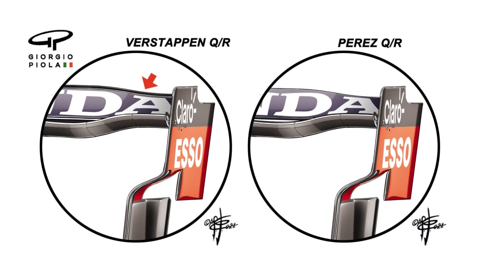 With the weather forecasts insisting heavy, unremitting rain for Sunday and the wing choices having to be made before qualifying, both teams ended up going for the higher downforce of their available choices. In addition, Mercedes ran a gurney flap on the trailing edge of their wing, to give an extra edge of downforce. Red Bull reverted to the wing they had used on Friday.