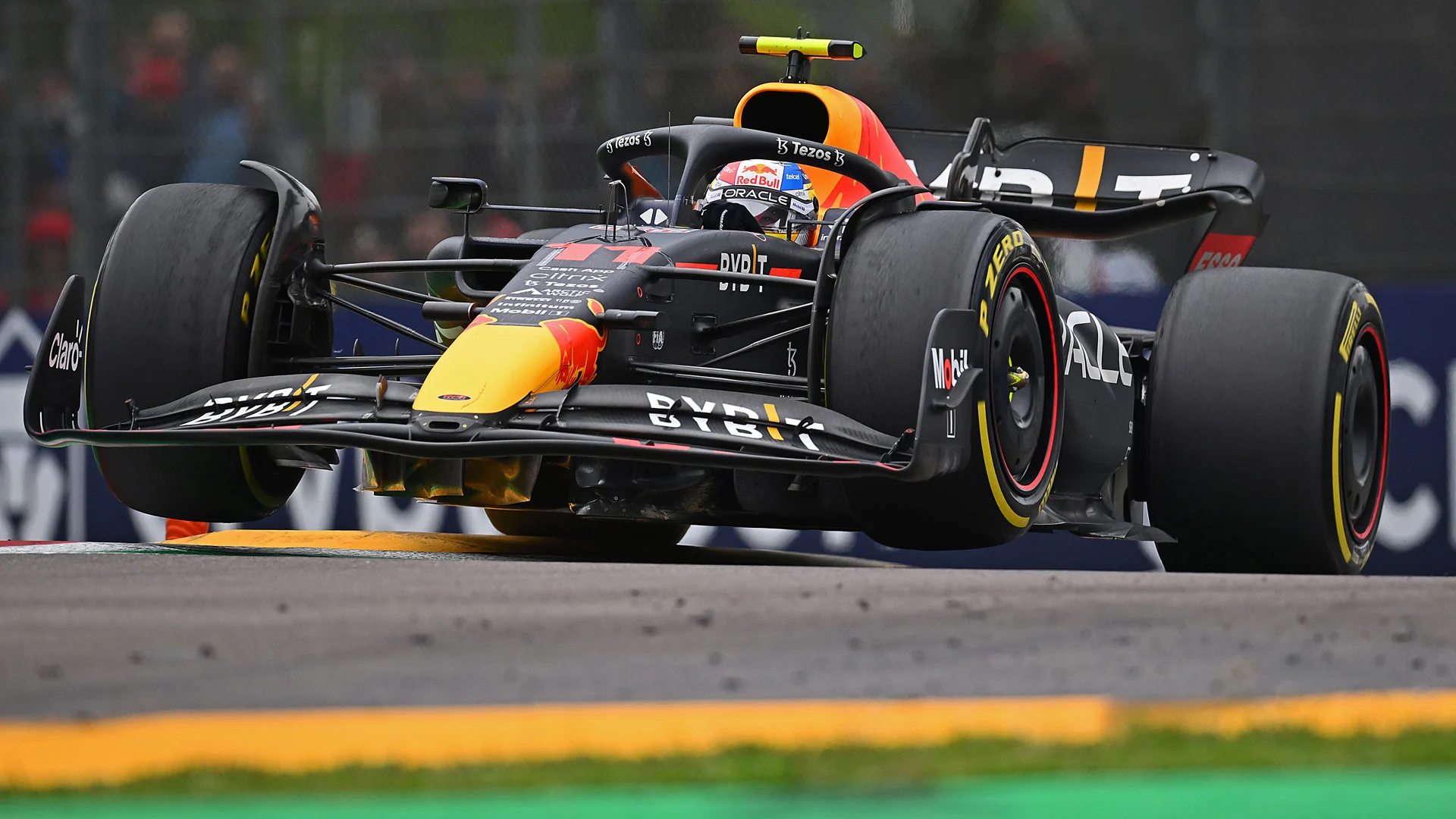 When there's a bump in the road, such as a kerb on an F1 circuit, the tyre runs over it and a force is applied to the tyre and the wheel.