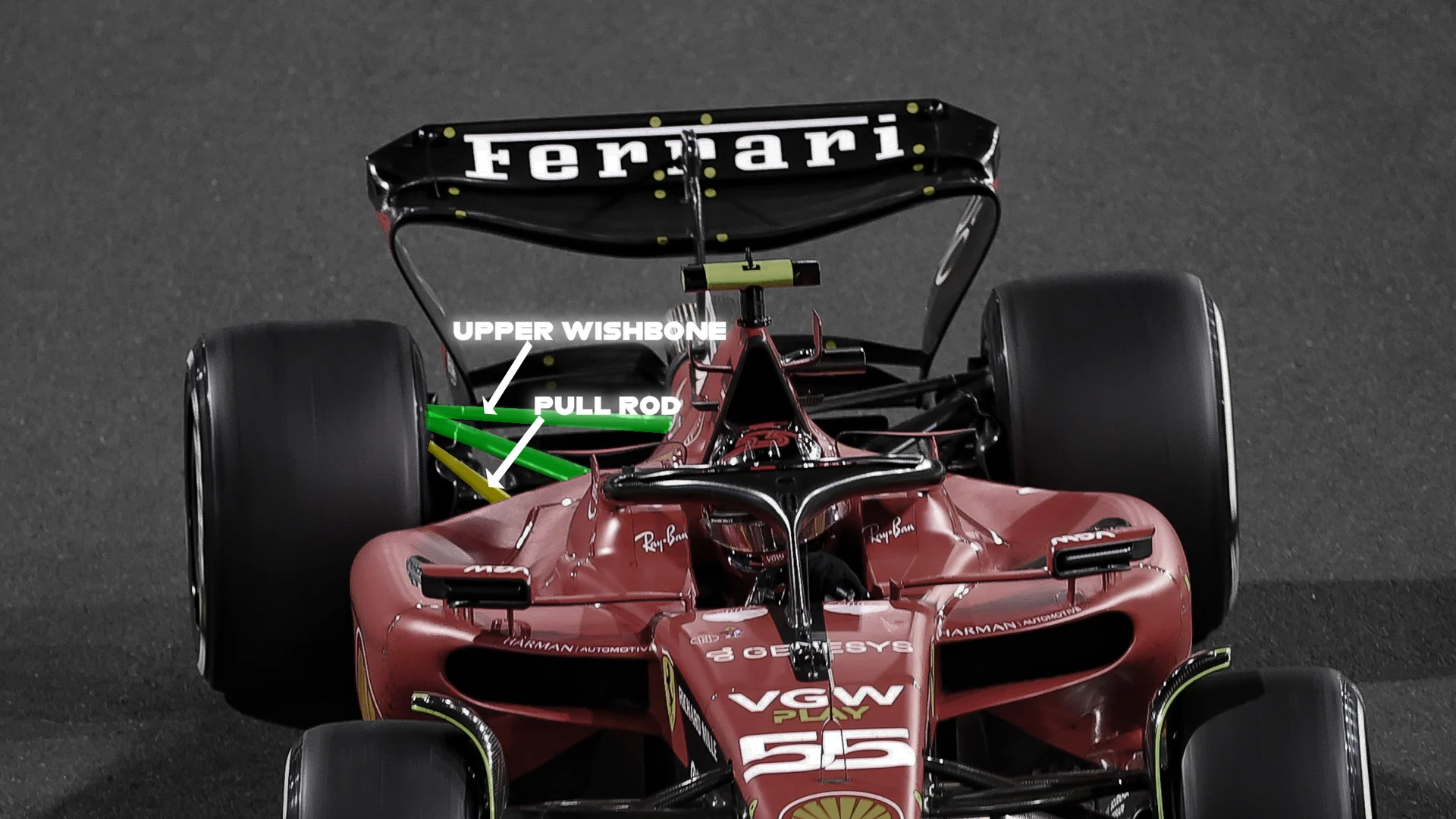 The elements connecting the tyre to the suspension are often visible in open-wheel cars and F1 is no different. Being exposed, those visible elements also play an important aerodynamic role in an F1 car.