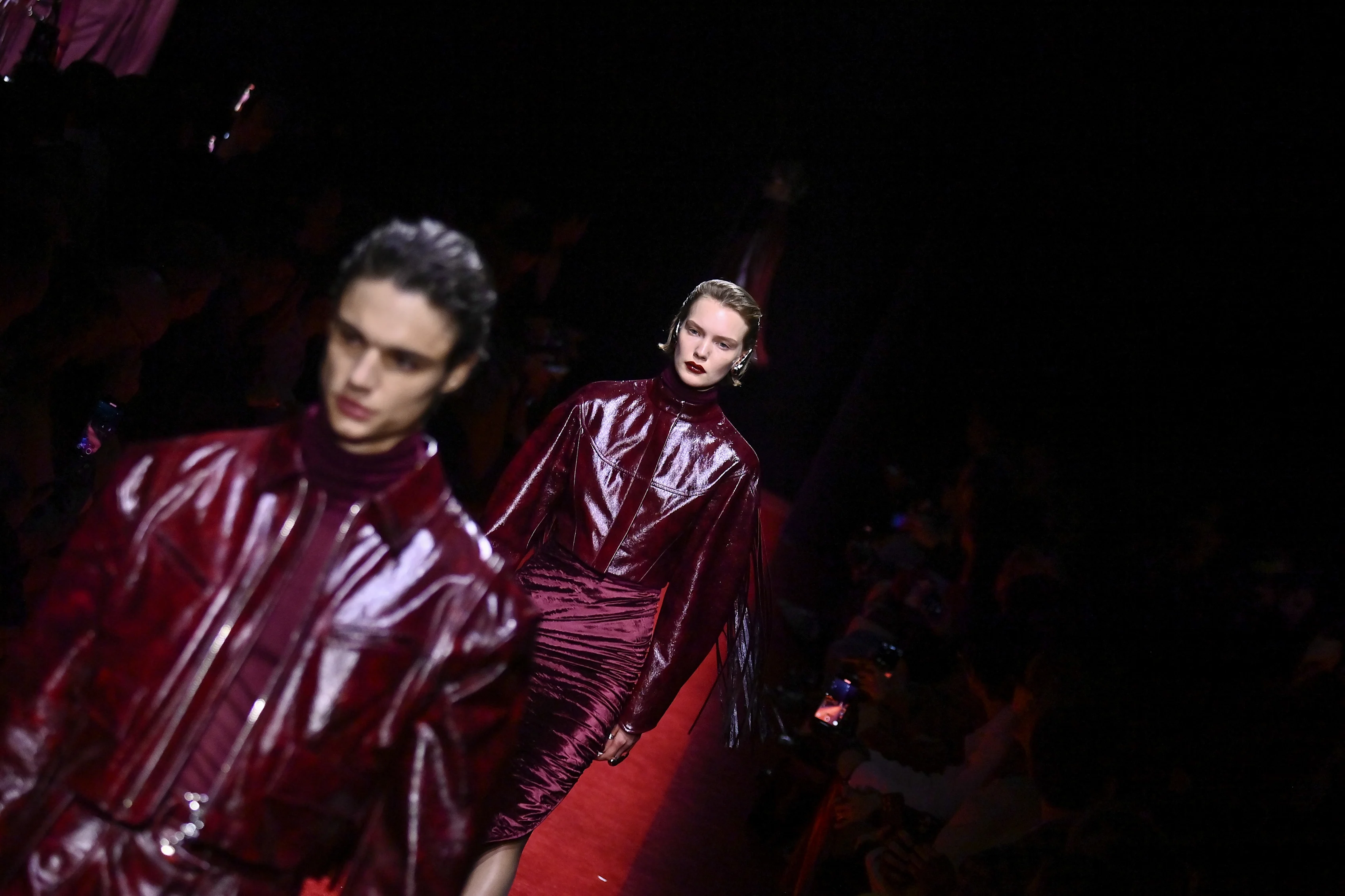 Alongside leather, denim will also have its moment, especially in total looks, denim-on-denim, and jumpsuits that echo the utilitarian, garage-workwear aesthetic. When it comes to colour, racing-red accents and deep burgundy remain key – shades that immediately evoke motorsport imagery.
