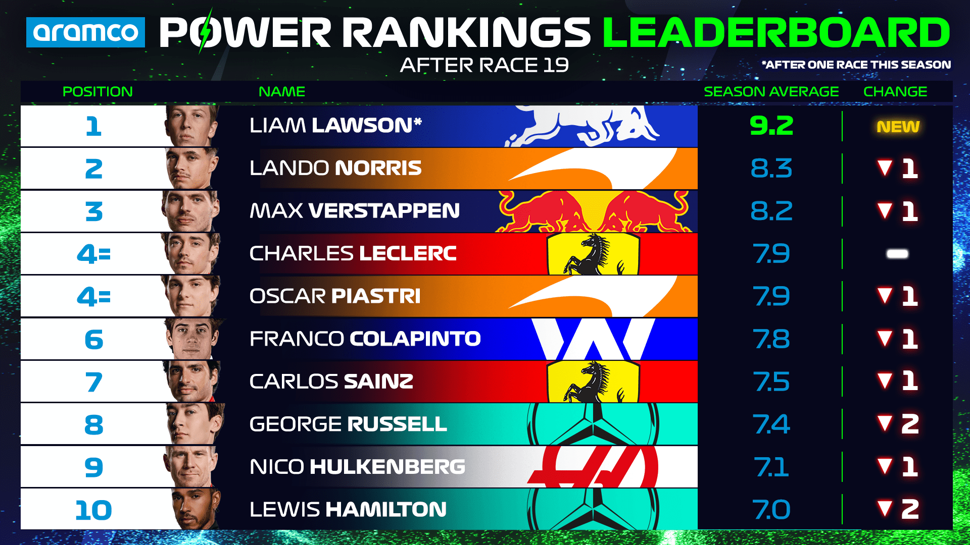 Oscar Piastri just missed out on a place in the top half of the Power Rankings field, having spent the event in team mate Norris’s shadow, while at the other end of the order, Lewis Hamilton was given the lowest combined score after a challenging weekend that he finished in the gravel trap.