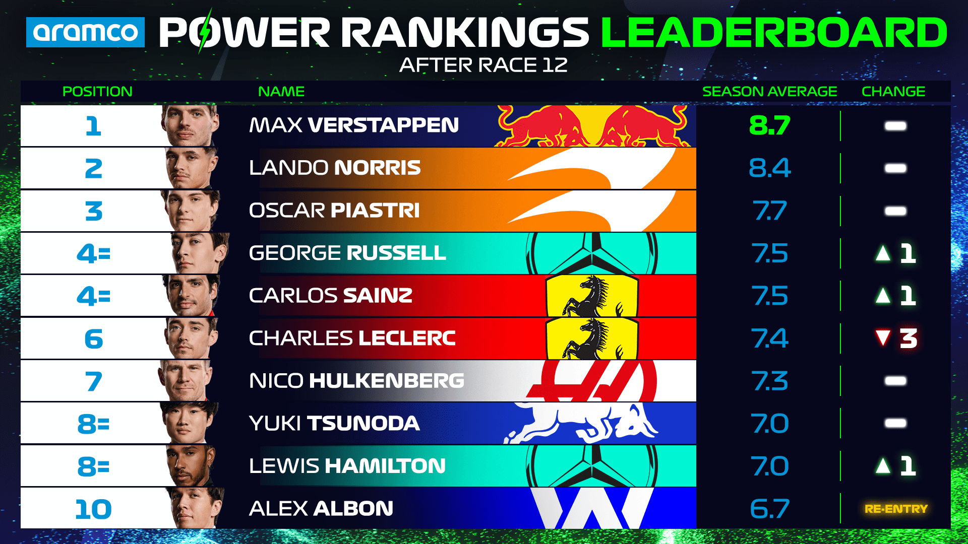 Runner-up might not match the lofty Verstappen heights we have been used to but this was still a very accomplished race from both him and his team. After charging down Norris for P2 late on the race, Verstappen rightly hailed Red Bull’s strategy calls – made at the right time – for lifting him up the order after he was initially worried their day could end as low as fifth or sixth. Our judges took note as Verstappen maximised what was possible.