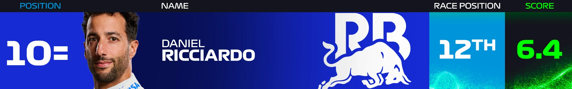 Daniel Ricciardo joined team mate Tsunoda in Q3 as his largely positive trend continued at the Hungaroring. However, his hopes of joining the Japanese racer in the points were derailed when the two drivers went separate ways in terms of strategy: Ricciardo two-stopping into traffic and Tsunoda going for a more effective one-stop. Given that crucial difference, which dropped him out of the running for a reward, and given the pace he had shown up to that point, the Australian earned some solid scores from the judges.