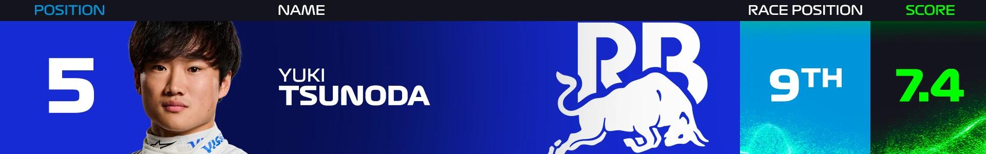 Yuki Tsunoda’s weekend took a dramatic turn for the worse when he crashed out of Q3, bringing a halt to what had been an impressive qualifying display up to that point. But he more than made up for it on race day, delivering an assured run to P9 to make it back-to-back points finishes and seven for the campaign – topping up RB’s tally in a tight midfield battle.