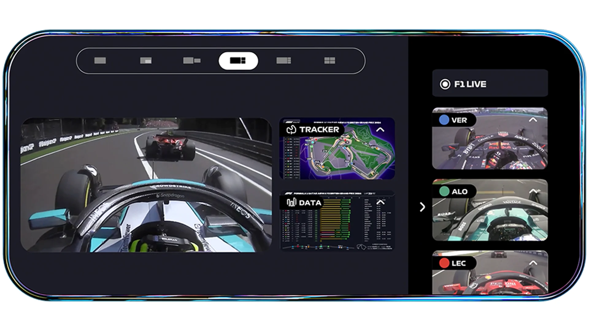 Multiview lets you select different feeds from the broadcast – including the F1 live feed, the 20 driver onboard cameras and live timing pages, all together on one screen. You are in the director’s chair.